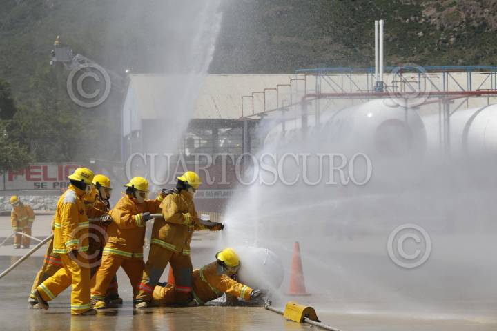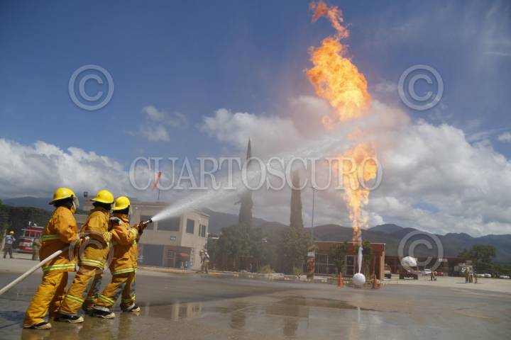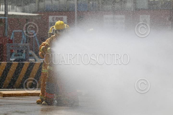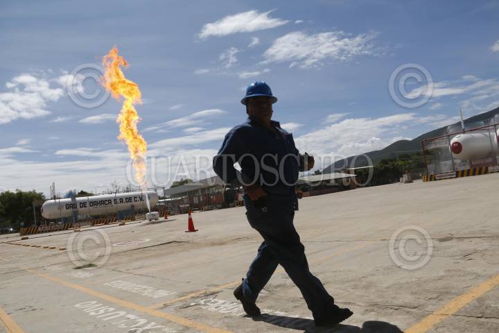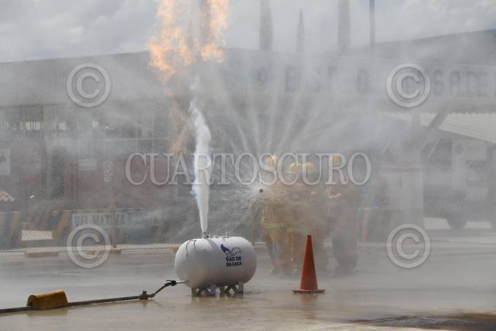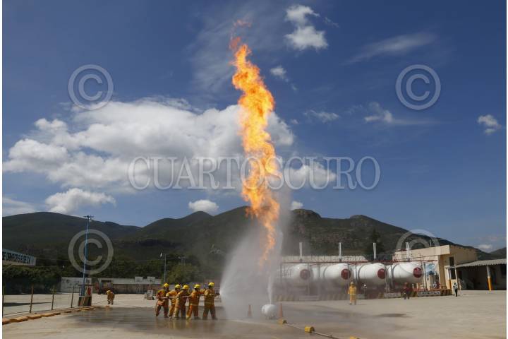 TLALIXTAC DE CABRERA, OAXACA, 25SEPTIEMBRE2015.- La empresa Gas de Oaxaca realizó este viernes un simulacro de una fugas de gas en sus instalaciones para clausurar la XXI Semana de Seguridad. Durante la actividad se le prendió fuego a una fuga de gas en un tanque LP, ante lo cual los trabajadores fueron desalojados, inmediatamente un equipo de de empleados capacitados para reaccionar ante acontecimientos de este tipo utilizando equipo adecuado y mangueras apagaron el fuego y controlaron la fuga, posteriormente el heroico cuerpo de Bomberos intervino para realizar la misma acción. Miembros de la Coordinación Estatal de Protección Civil verificaron que el lugar sea seguro, como parte del protocolo. FOTO: ARTURO PÉREZ ALFONSO /CUARTOSCURO.COM