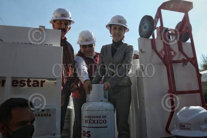 Claudia Sheinbaum Pardo, jefa de Gobierno de la Ciudad; Gustavo Álvarez Vázquez, director del Gas del Bienestar, y Armando Quintero Martínez, alcalde de Iztacalco, durante la puesta en marcha del Gas del Bienestar en la alcaldía Iztacalco.