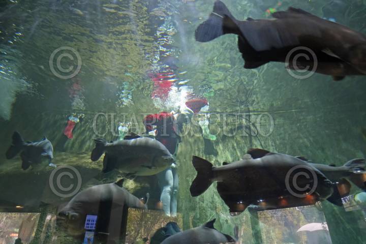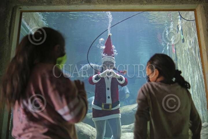Una mujer con indumentaria de Santa Claus y con equipo de buzo que nada en el acuario de el Zoológico de Guadalajara, entra al tanque para dar un espectáculo navideño.