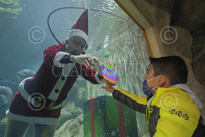 Un niño interactúa con una mujer con indumentaria de Santa Claus y con equipo de buzo que nada en el acuario de el Zoológico de Guadalajara.