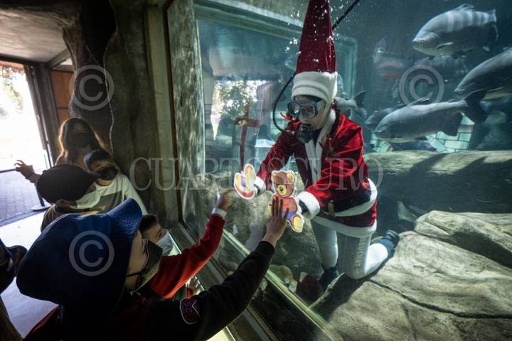 Niños interactúa con una mujer con indumentaria de Santa Claus y con equipo de buzo que nada en el acuario de el Zoológico de Guadalajara.