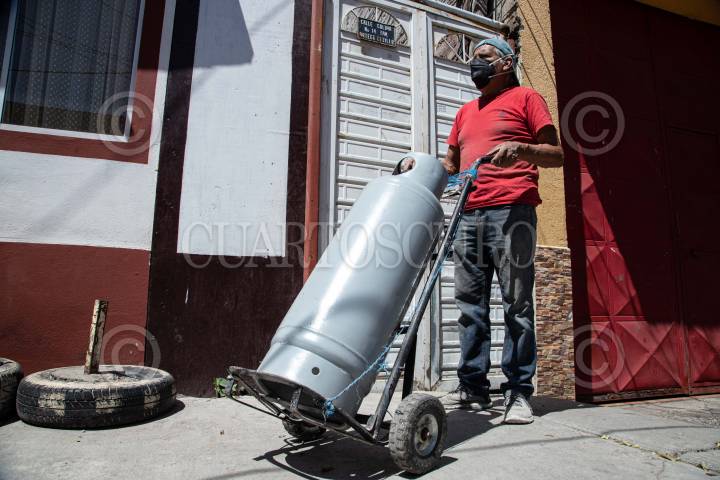 Un hombre con un diablito sale de su domicilio a cargar su tanque de gas este domingo en que entra en vigor el aumento al gas licuado de petróleo (LP) en la Ciudad de México y Estado de México del 1.4 por ciento.