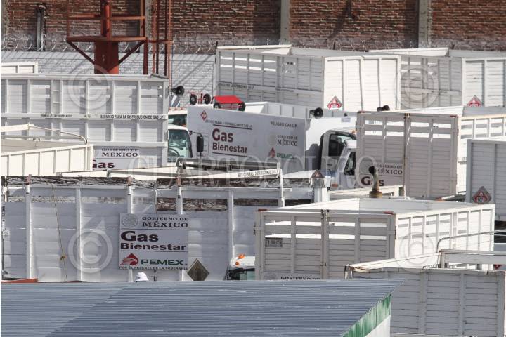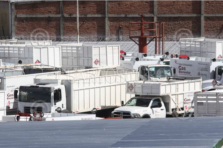 Camiones de distribución de cilindros de Gas Bienestar en la Planta de distribución.