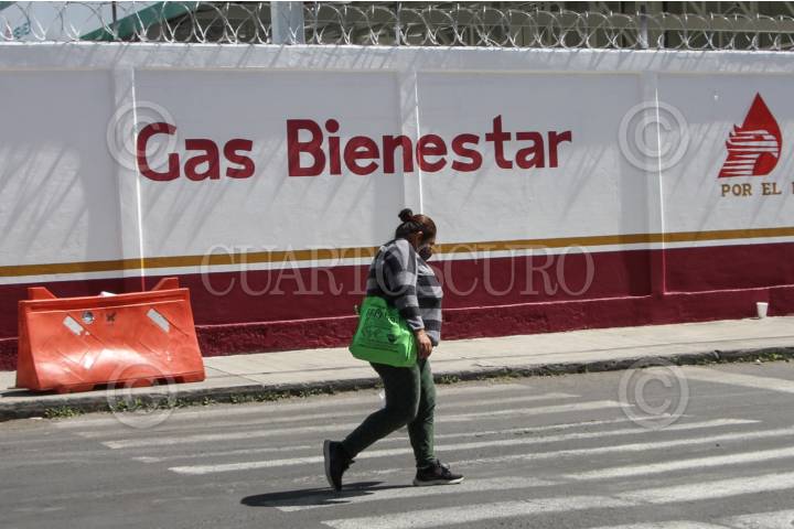 Una señora con bolsa de mandado camina al exterior de la Planta de distribución Gas Bienestar.
