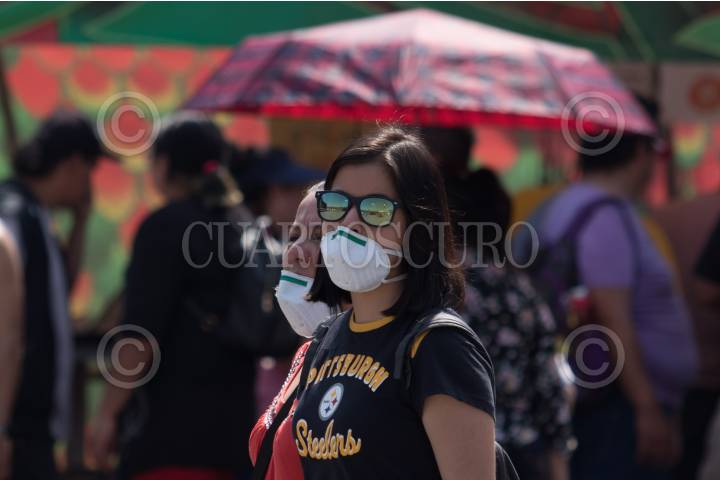 Una mujer pasea camina por calles de la ciudad usando un tapabocas. La Ciudad de México es la entidad con mayores casos de contagios confirmados y la que concentra la mayor tasa de mortalidad por Coronavirus.
