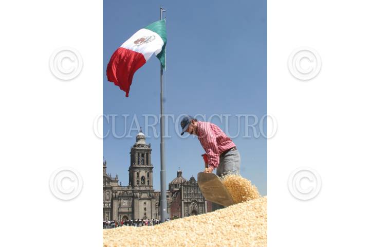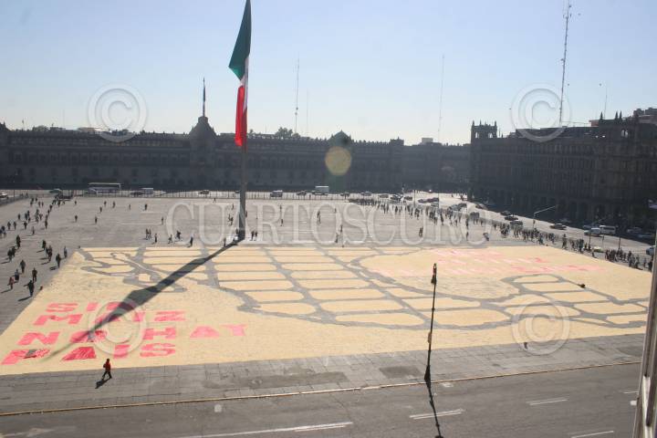 MÉXICO, D.F., 26FEBRERO2009.- Miembros de la organización -Greenpeace- se manifestaron en la plancha del Zócalo Capitalino construyendo un tapiz gigantesco hecho con maíz trasgenico para manifestase en contra de este producto, este tapete tenia escrita la leyenda "Sin maíz no hay país" FOTO: LUIS CARBAYO/CUARTOSCURO.COM