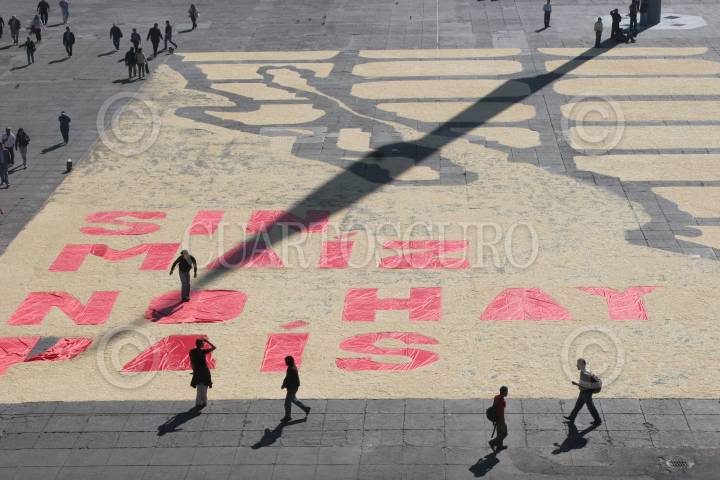 MÉXICO, D.F., 26FEBRERO2009.- Activistas de la organización Greenpeace se manifestaron en la plancha del Zocalo Capitalino construyendo un tapiz gigantesco hecho con maíz trasgenico para manifestase en contra de este producto, este tapete tenia escrita la leyenda "Sin maíz no hay país" FOTO: RICARDO CASTELAN/CUARTOSCURO.COM