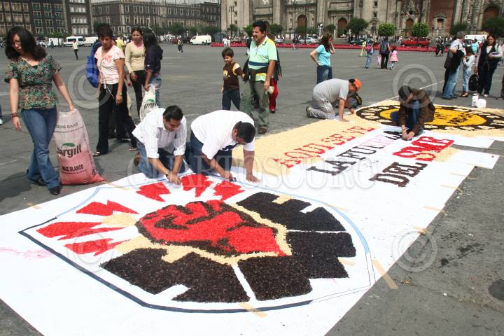 MÉXICO, D.F., 30OCTUBRE2009.- Integrantes del PRD del Distrito Federal, realizaron un tapete de aserrin en la plancha del zocalo capitalino en apoyo al movimiento del SME. FOTO: SAÚL LÓPEZ/CUARTOSCURO.COM