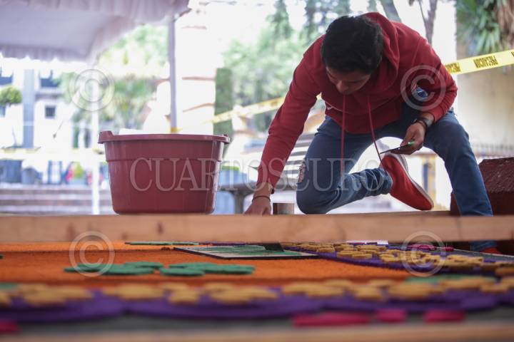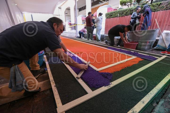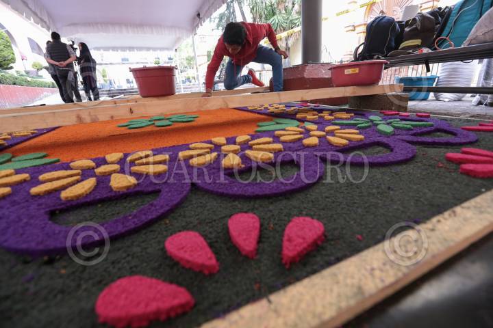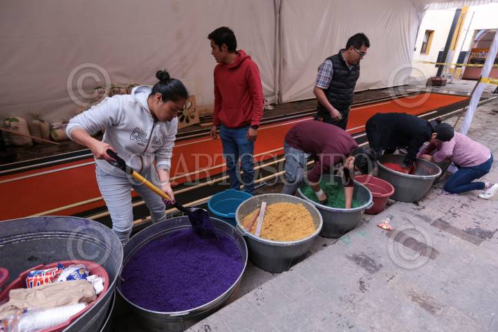 TOLUCA, ESTADO DE MÉXICO, 18OCTUBRE2019.- El maestro artesano Tomas Velázquez y su equipo trabajan en un tapete monumental por el Día de Muertos que medirá 30 metros de largo por 2.50 metros de ancho, utilizando aserrín de colores, estará instalado en el corredor entre la iglesia Sabta Veracruz y los Portales de Toluca, esto como parte de las actividades del Festival del Alfeñique en Toluca. FOTO: CRISANTA ESPINOSA AGUILAR /CUARTOSCURO.COM