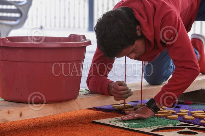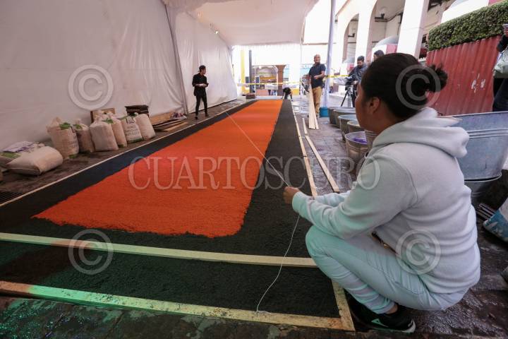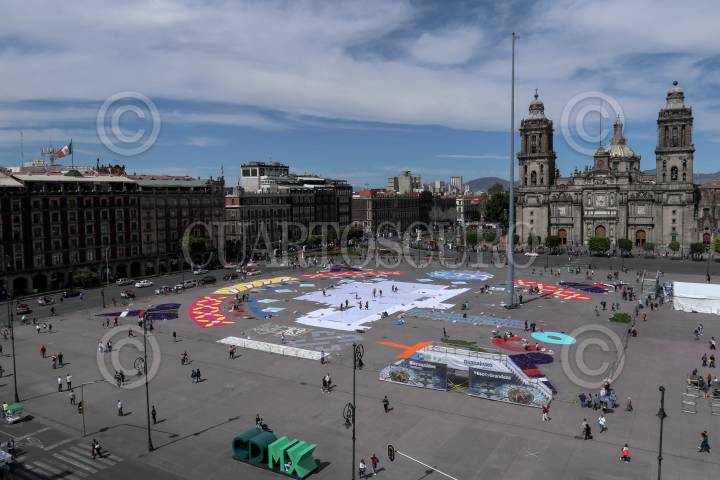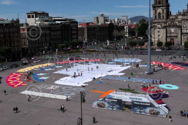 Trabajos de instalación de la alfombra monumental en el Zócalo.