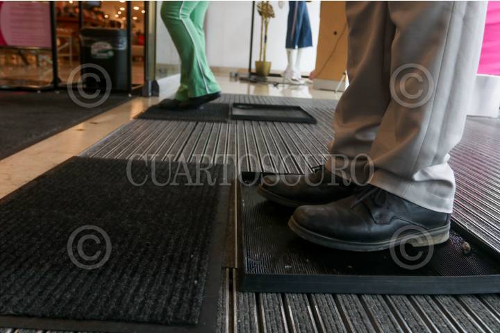 Capitalinos sanitizan sus zapatos antes de ingresar a una tienda comercial de Parque Tezontle