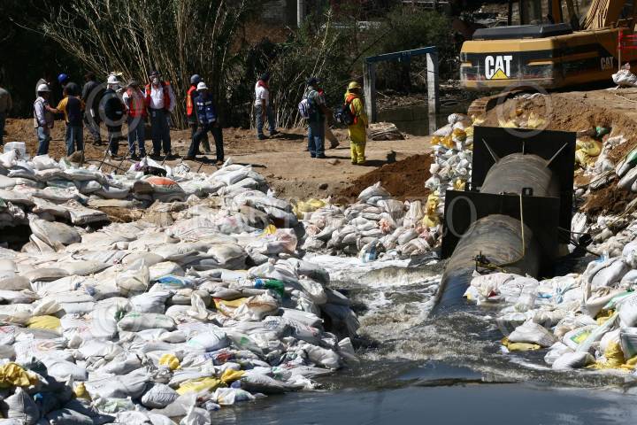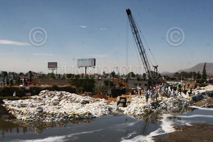 CHALCO, ESTADO. DE MEXICO., 09FEBRERO2010.- Sólo una hora funcionó el "tapón" que la Conagua y elementos del ejercito policia estatal colocaron en el canal de la Compañía para contener que se siga inundando las calles y avenidas de Chalco y Valle de Chalco. FOTO: SAUL LOPEZ/CUARTOSCURO.COM