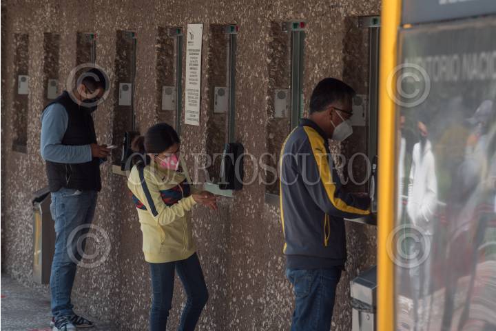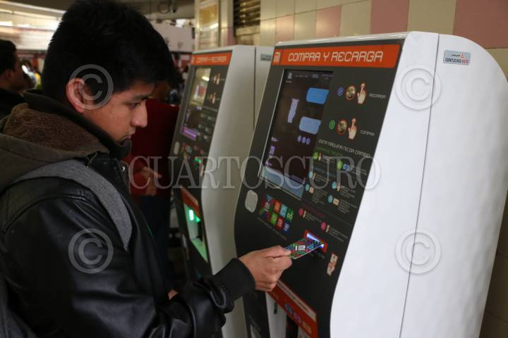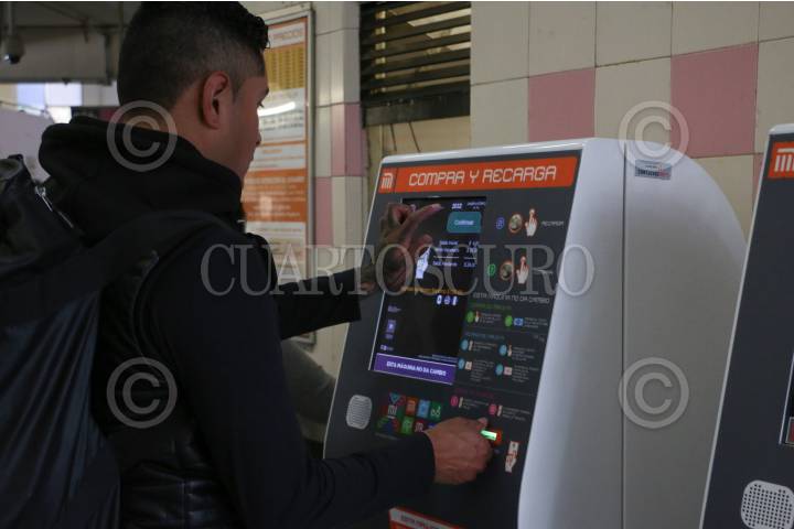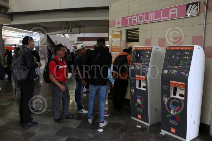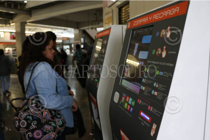 Usuarios comienzan a utilizar las maquinas de recarga de tarjetas instaladas por el Sistema de Transporte Colectivo Metro en la estación Observatorio de la Línea Rosa.