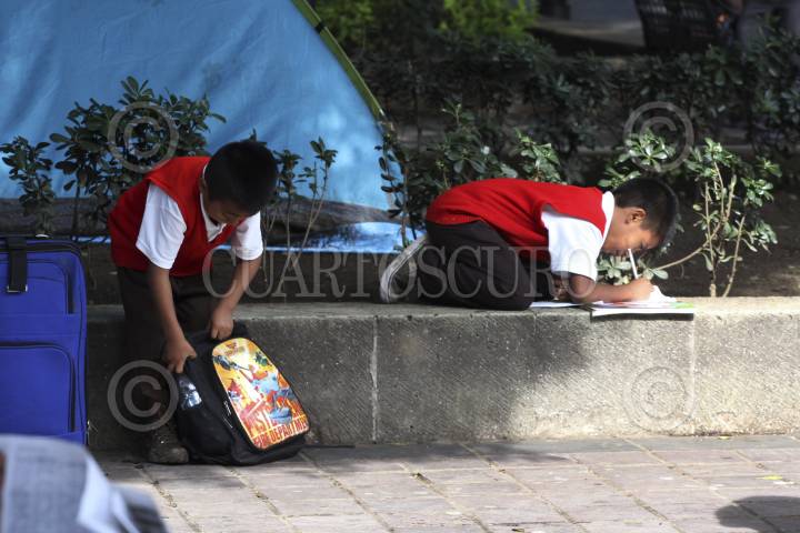 OAXACA, OAXACA, 12SEPTIEMBRE2014.- Un par de niños hijos de vendedores ambulantes que se ubican en el zócalo de la ciudad de Oaxaca se preparan para las clases y culminan su tarea. FOTO: ARTURO PÉREZ ALFONSO /CUARTOSCURO.COM
