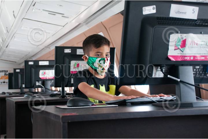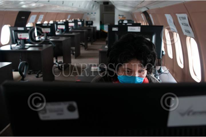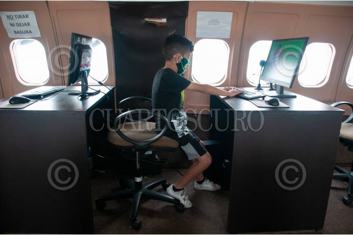 El avión biblioteca cuenta con distintas computadoras para facilitar a los jóvenes el acceso a sus clases en línea.