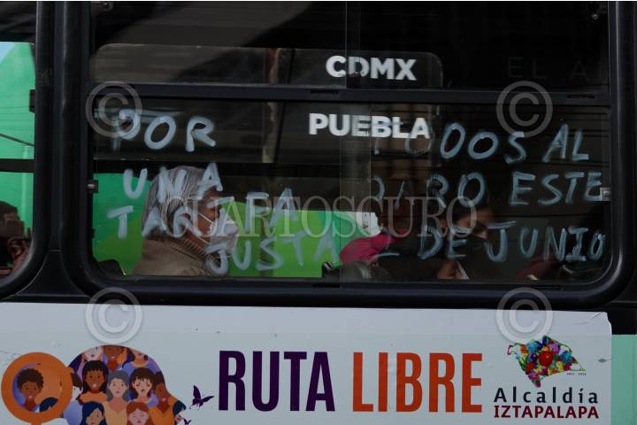 Con el letrero “Con una tarifa justa”, un camión de la alcaldía Iztapalapa exige el aumento para el 2 de junio