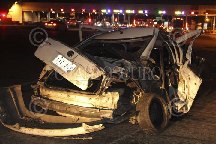 ACOLMAN, EDO. DE MÉXICO, 20AGOSTO2009.- En el kilómetro 16 de la autopista México-Pirámides se registró un accidente donde dos mujeres perdieron la vida y otros dos resultaron lesionados. Se trata de un taxi Tsuru con placas particulares 584TAF el cual fue arrollado por la parte trasera por un trailer que se dio a la fuga FOTO: LUZ ACEVEDO/CUARTOSCURO.COM