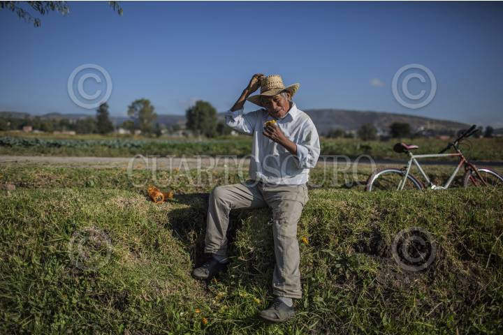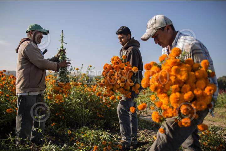 TARÍMBARO, MICHOACÁN, 01NOVIEMBRE2016.- La familia Alvarado siembra sus tierras con flor de Cempasuchilt, nube, mota y panal desde hace varias generaciones, cada junio y agosto esparcen las semillas en sus tierras. Hermilo, Manuel y Ausencio junto con Julian (amigo de toda la vida de su padre), se reunen en el ejido el Colegio para cosechar las tierras de flor que se usan esta temporada de venerar a los muertos. FOTO: ALAN ORTEGA /CUARTOSCURO.COM
