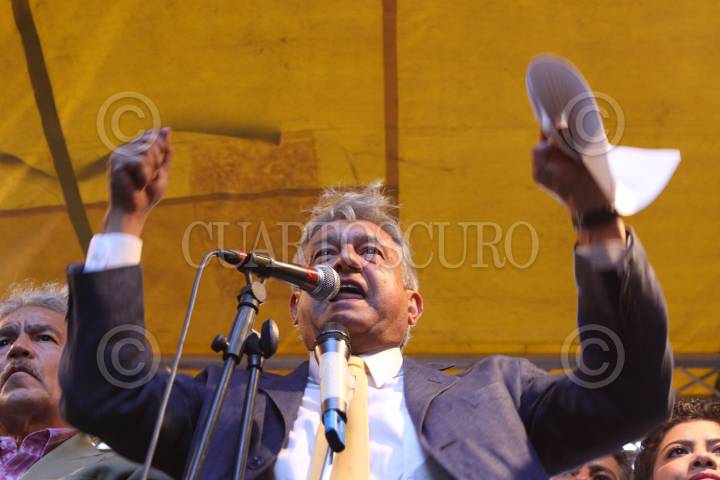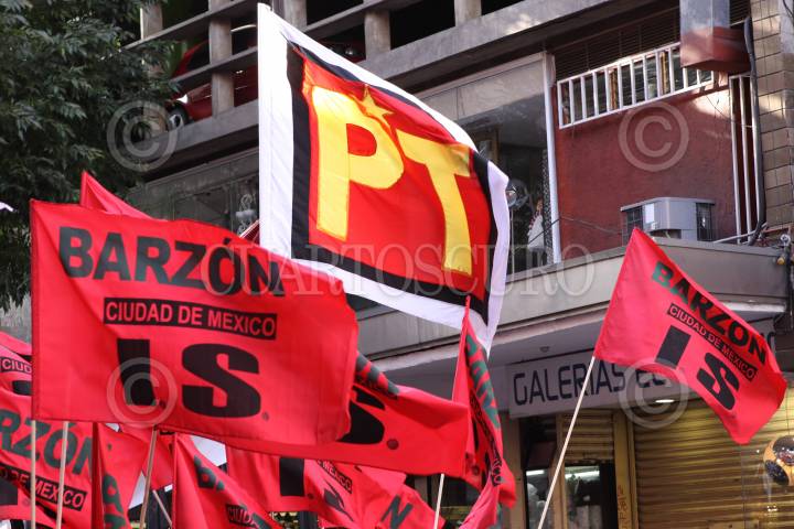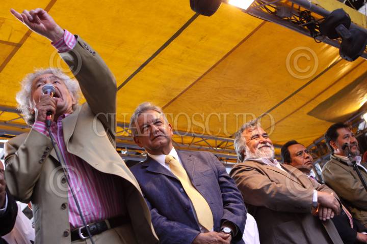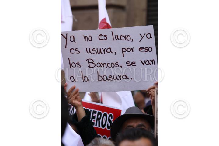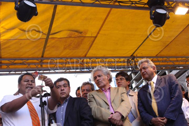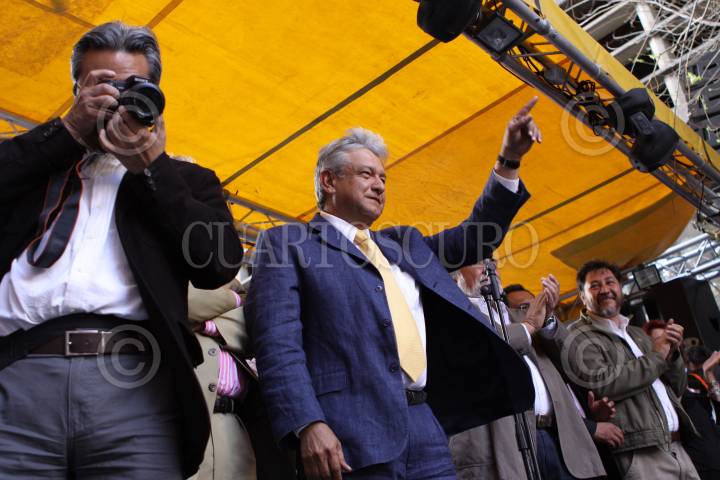 MÉXICO, D.F., 03MARZO2009.- Con simpatizantes del Partido del Trabajo, Partido Convergencia y Barzonista, Andrés Manuel Lópes Obrador, encabezó una protesta afuera de la Asociación de Bancos de México, en protesta por la venta de dólares por parte del Banco de México y así detener la devaluación del peso. FOTO: MOISÉS PABLO/COMOSCURO.COM