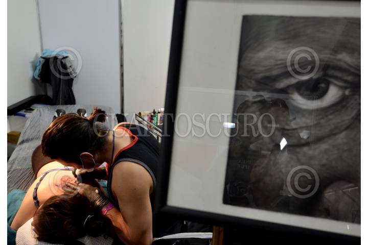 aspectos del trabajo de tatuaje durante la expo Tattoarte 2021 en la sala de Armas de Ciudad Deportiva en Iztacalco