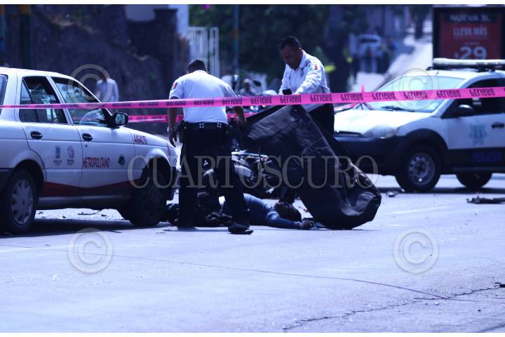 Dos agentes de tránsito cubren el cadáver de un motociclista que chocó contra un taxi en la avenida Plan de Ayala en Cuernavaca.