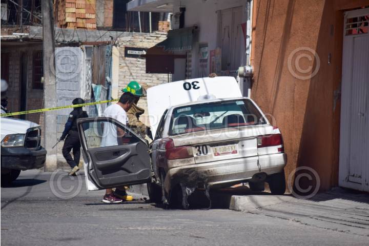 CHILPANCINGO, GUERRERO, 06FEBRERO2024.- Un motociclista solitario intentó incendiar un taxi del servicio público local de Chilpancingo que se encontraba estacionado en la Colonia Los Ángeles. Fue unos 20 minutos pasado el mediodía cuando se registró el conato de incendio del vehículo que estaba estacionado en la Calle Ricardo Palmerín el cual no se consumó. De acuerdo con los vecinos, un sujeto a bordo de una motocicleta lanzó un tipo de combustible flamable y le prendió fuego y se retiró de inmediato, lo que permitió que de inmediato sofocaran el fuego. La unidad, resultó con afectaciones en un neumático, y la parte trasera que fueron alcanzados por el fuego, sin que en este ataque resultara ninguna persona lesionada. FOTO: DASSAEV TÉLLEZ ADAME/CUARTOSCURO.COM