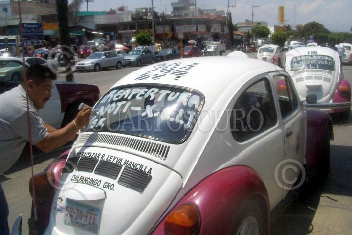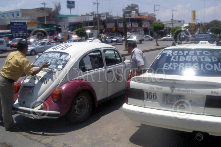 CHILPANCINGO,GUERRERO 14JUNIO2005.- Varios taxistas pintaron sus cristales en apoyo a los periodistas Gamaliel Garcia y Noe Segura, locutores de la XELI quienes se vieron afectados, al cerrarse el espacio de noticias que conducian, debido a las criticas que hacian contra el gobierno del estado que encabeza Zeferino Torreblanca, coartando de esta manera su libertad de expresión. FOTO: Oscar Alvarado/CUARTOSCURO.COM