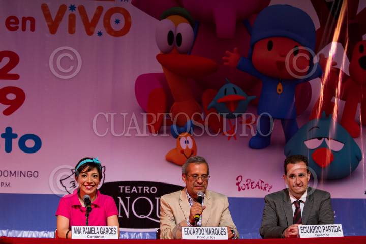 MÉXICO, D.F., 21JULIO2015.- El espectáculo musical de Pocoyo se presentará en el Teatro Blanquita los días 1, 2, 8 y 9 de agosto en funciones de matiné. Acompañado de sus amigos Pato, Elly, Loula, Pulpo y Pajaroto, los pequeños disfrutarán de grandes aventuras. Durante la conferencia de prensa, la cantante Ana Pamela Garcés, el productor Eduardo Marqués y el director Eduardo Partida, aseguraron que los con este espectáculo los pequeños serán estimulados a bailar, cantar, reír y gozar. FOTO: MOISÉS PABLO /CUARTOSCURO.COM