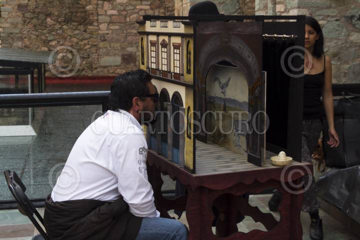 GUANAJUATO, GUANAJUATO, 20OCTUBRE2017.- Teatreros cuentan breves historias a través de mirillas; ayudados de marionetas, dibujos de cartón, pequeños escenarios y una silla, por que estos montajes están pensados para que sean observados por una persona. Los artistas abordan "El Quijote de la Mancha" en breves relatos que pretenden dejar datos muy precisos de estas joyas de la literatura y quizás de una forma indirecta invitar a conocer la obra en sí. FOTO: MOISÉS PABLO /CUARTOSCURO.COM