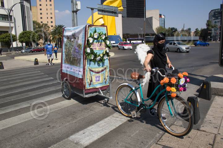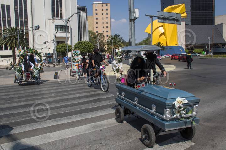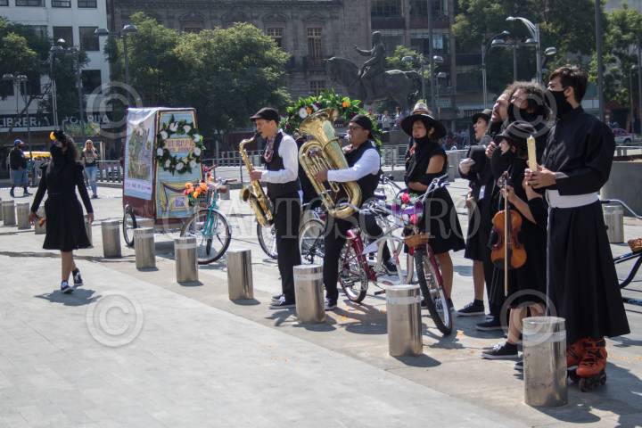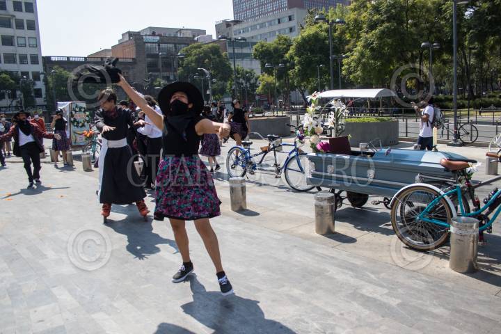 La compañía Teatro Entre 2 estrenó "Funeral sobre ruedas" una intervención escénica inspirada en el Día de Muertos. Los actores recorrieron avenida Juárez vestidos de negros y tocando instrumentos musicales parodiando lo que es un cortejo fúnebre.
