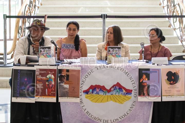 Raúl Pérez Pineda, Rocío Carolina Loa Rosales, Ivonne Pérez Esquivel, y Beatriz Serrano Altamirano, durante el anunció de la gira teatral de la Compañía Teatro de los Volcanes por el centro del país.