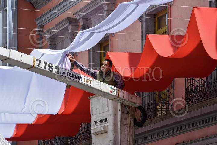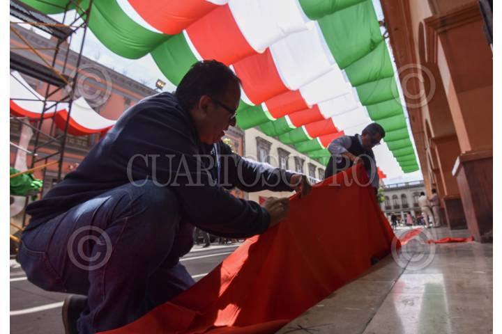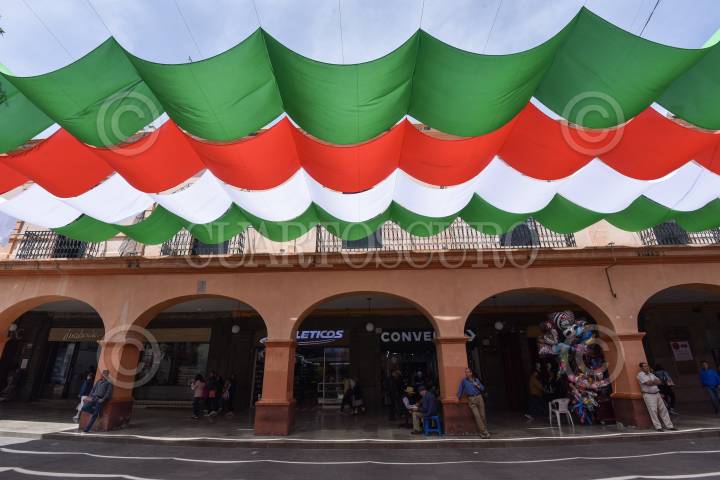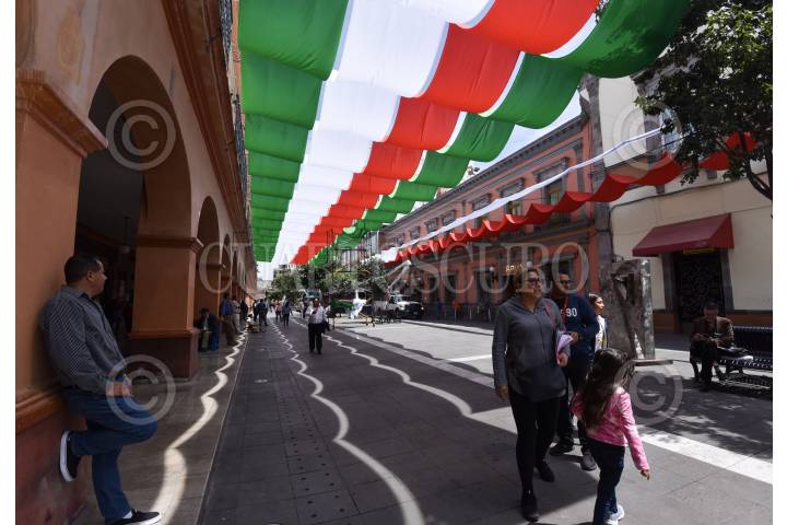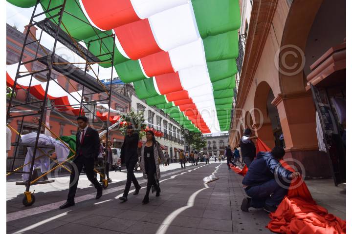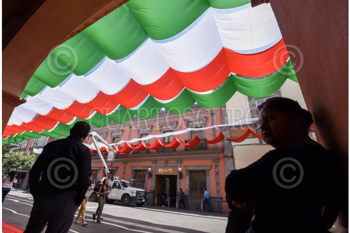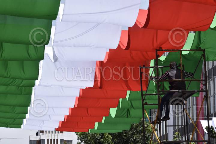 TOLUCA, ESTADO DE MÉXICO, 06SEOTIEMBRE2019.- Después de tener gran éxito con el techo de sombrilla en el Andador Constitución en los Portales de Toluca ahora previo al festejo de las Fiestas Patrias se instala un techo tricolor que comienza a llamar la atención de los paseantes. FOTO: CRISANTA ESPINOSA AGUILAR /CUARTOSCURO.COM