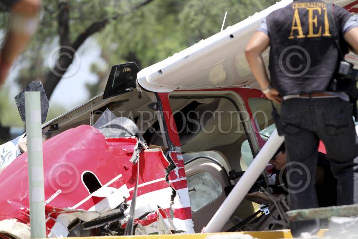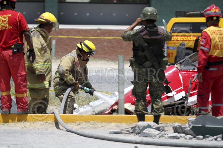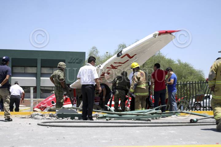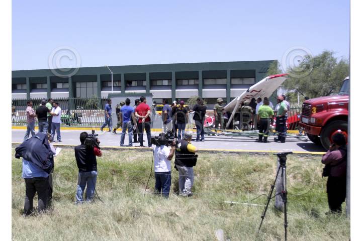 MONTERREY, NUEVO LEÓN, 05AGOSTO2013.- Dos hombres, que volaban en una avioneta procedente de Ciudad Victoria, Tamaulipas, resultaron heridos al estrellarse la aeronave contra una barda de la Universidad Tecnológica de Escobedo, ubicada a tres kilómetros del aeropuerto del norte de Monterrey, destino final al que pretendían llegar. La aeronave presentó fallas técnicas que aún no han sido especificadas. FOTO: GABRIELA PÉREZ MONTIEL / CUARTOSCURO.COM