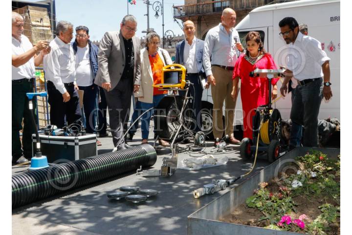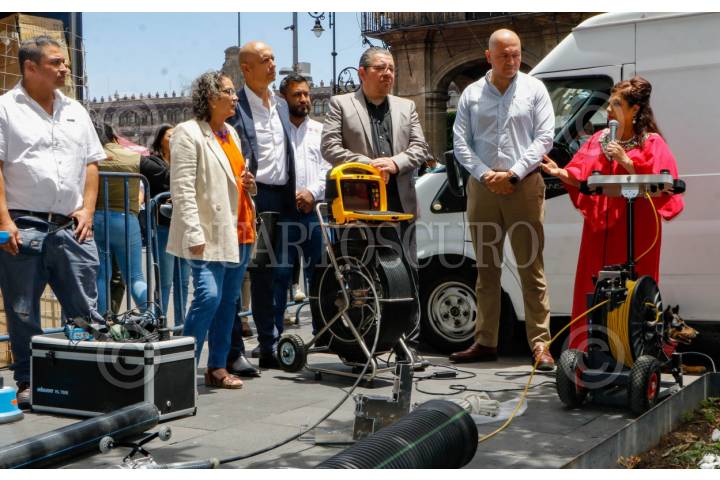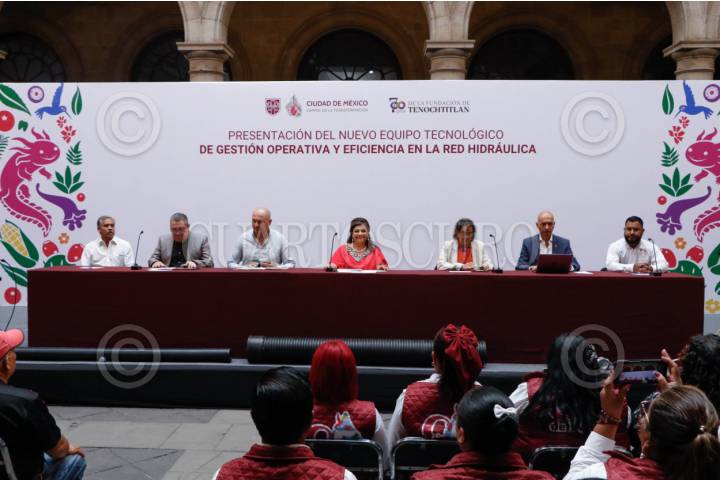 CIUDAD DE MÉXICO, 15ABRIL2025.- La jefa de Gobierno, Clara Brugada Molina, presentó el nuevo equipo de última tecnología para la detección y atención de fugas de agua no visibles, que permite mejorar la eficiencia en la reparación de la red hidráulica de la Ciudad de México y recuperar un caudal de 600 litros por segundo al año, equivalente al suministro para 180 mil personas. En conferencia de prensa, realizada en el Antiguo Palacio del Ayuntamiento, la mandataria capitalina planteó que la meta de este año es reparar 4 mil 500 fugas no visibles y, con ello, se recuperará un caudal similar a crear 10 pozos nuevos o al volumen de 63 mil viajes de pipas. FOTO: GOBIERNO DE LA CIUDAD DE MÉXICO/CUARTOSCURO.COM