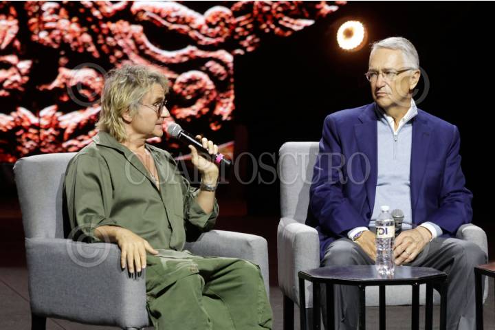 PUEBLA ,PUEBLA, 31MAYO2025.- Nacho Cano, compositor y productor discográfico español, conversa con el empresario Ricardo Salinas Pliego, durante su el ciclo de conferencia del último día del Festival de las Ideas 2025. FOTO: MIREYA NOVO/CUARTOSCURO.COM