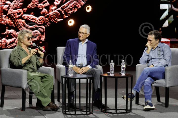 PUEBLA ,PUEBLA, 31MAYO2025.- Nacho Cano, compositor y productor discográfico español, conversa con el empresario Ricardo Salinas Pliego, y con el escritor mexicano Juan Miguel Zunzunegui durante su el ciclo de conferencia del último día del Festival de las Ideas 2025. FOTO: MIREYA NOVO/CUARTOSCURO.COM