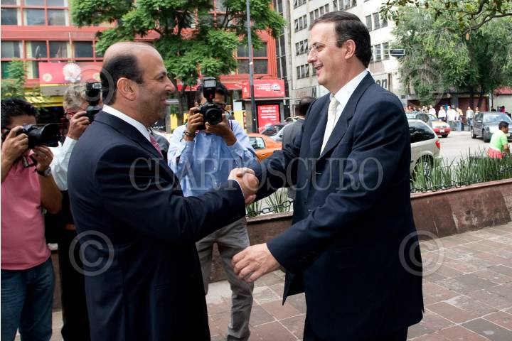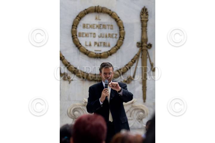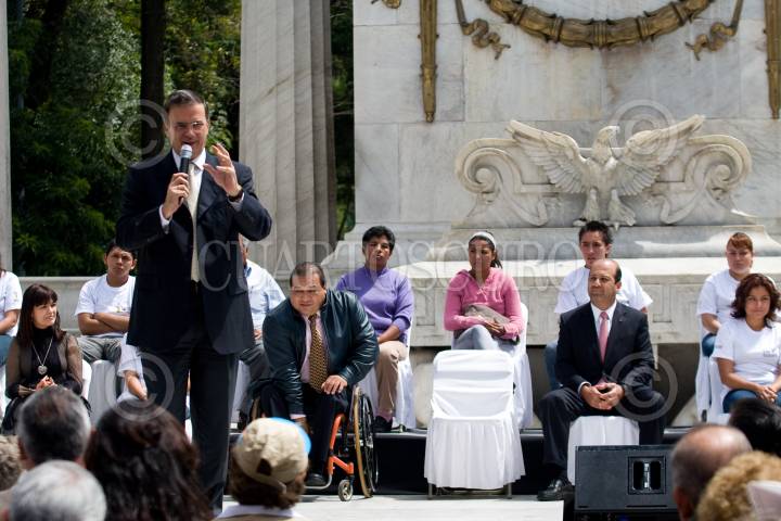 MÉXICO D.F., 15JULIO2010.- Marcelo Ebrard Casubon, Jefe del Gobierno Capitalino, acompañado de Héctor Slim, Director de Telmex, durante la presentación de "Telmex 2010, Impulso a la Innovación Tecnológica” esto en el Hemiciclo a Juárez de la Alameda Central, el gobierno capitalino en colaboración con Telmex, realizara la instalación de casetas telefónicas para personas con discapacidad y la puesta en marcha de bibliotecas digitales en el Centro Histórico, donde se ofrece el préstamo de una computadora lap-top durante 15 días y donde se incluye el servicio gratuito de WiFi en sitios públicos. FOTO: GUILLERMO PEREA/CUARTOSCURO.COM