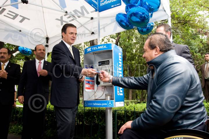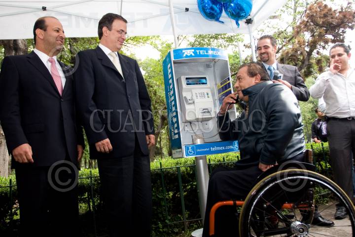 MÉXICO D.F., 15JULIO2010.- Marcelo Ebrard Casubon, Jefe del Gobierno Capitalino, acompañado de Héctor Slim, Director de Telmex, durante la presentación de Telmex 2010, “Impulso a la Innovación Tecnológica” esto en el Hemiciclo a Juárez de la Alameda Central, el gobierno capitalino en colaboración con Telmex, realizara la instalación de casetas telefónicas para personas con discapacidad y la puesta en marcha de bibliotecas digitales en el Centro Histórico, donde se ofrece el préstamo de una computadora lap-top durante 15 días y donde se incluye el servicio gratuito de WiFi en sitios públicos. FOTO: GUILLERMO PEREA/CUARTOSCURO.COM