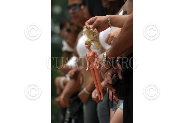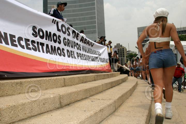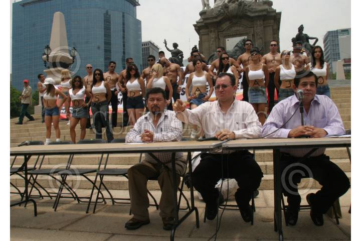 MÉXICO, D.F., 29MAYO2007.- El diputado Omar Ortega Alvarez y el diputado federal Juan Hugo de la Rosa García, encabezaron una protesta de la organización perredista "Los de Abajo" para pedir apoyo del gobierno federal para los grupos vulnerables que la integran. En la invitación al evento se invitaba a un desnudo masivo de 1100 feminas en el Angel por la pobreza en la que viven, sin embargo todo fue un engaño tras señalar segíun ellos que el comunicado se refería a muñeas "Barbies" en su lugar fueron un grupo de personas que se dedican a bailar en antros. FOTO: MOISÉS PABLO/CUARTOSCURO.COM