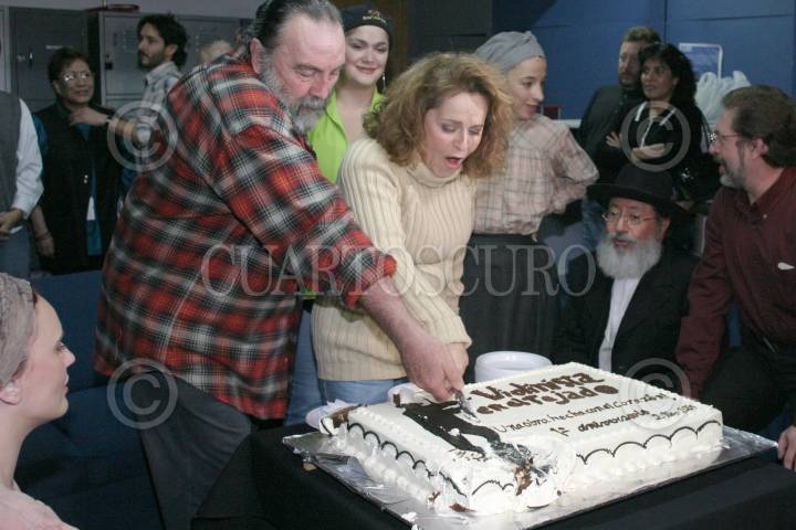 MEXICO, D.F., 09NOVIEMBRE2005.- Pedro Armendaría, Silvia Mariscal, cortaron el pastel para conmemorar un año de representaciones de El Violinista en el Tejado, que se presenta en el Centro Cultural Telmex. FOTO: Moisés Pablo/CUARTOSCURO.COM