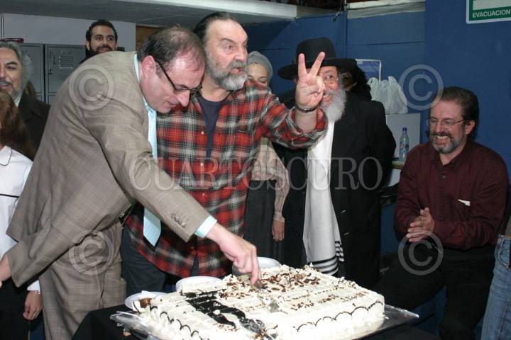 MEXICO, D.F., 09NOVIEMBRE2005.- Morris Gilbert, productor de teatro y Pedro Armendaríz, cortaron un pastel como parte de la celebración de un año de representaciones de El Violinista en el Tejado, que se presenta en el Centro Cultural Telmex. FOTO: Moisés Pablo/CUARTOSCURO.COM