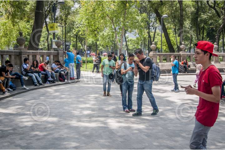 CIUDAD DE MÉXICO, 15AGOSTO2016.- Decenas de jóvenes continuan visitando la Alameda Central para jugar con la aplicación virtual ¨Pokémon Go¨. El juego ha causado furor en las últimas semanas, pues los jugadores pasan horas "cazando" a los personajes de la serie japonesa que van encontrando a su paso. FOTO: DIEGO SIMÓN SÁNCHEZ /CUARTOSCURO.COM