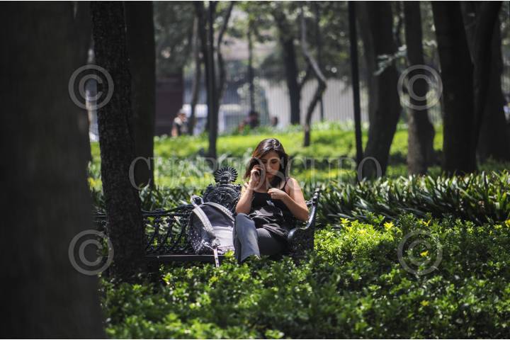 CIUDAD DE MÉXICO, 07SEPTIEMBRE2016.- Una joven habla por teléfono sentada en una banca del bosque de Chapultepec. FOTO: DIEGO SIMÓN SÁNCHEZ /CUARTOSCURO.COM