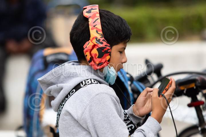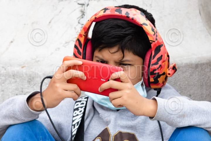 Niño con teléfono inteligente juega videojuegos en la explanada de Bellas Artes, en el marco de las vacaciones de verano.