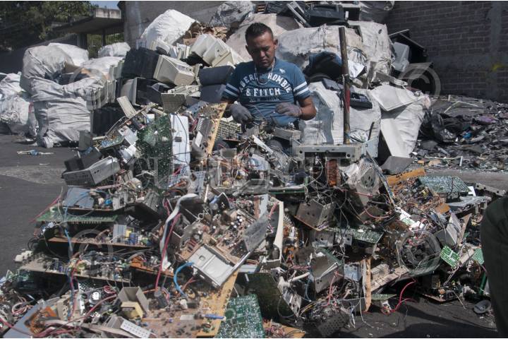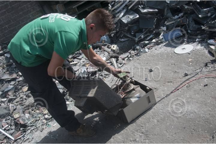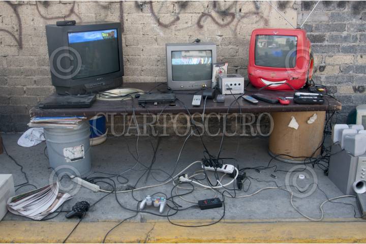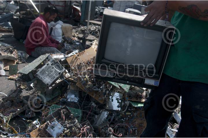 MÉXICO, D.F., 04DICIEMBRE2015.- El día de ayer el presidente de la República Enrique Peña Nieto entregó el aparato de señal digital número 8 millones 200 mil del total de 9.7 millones de televisores que se repartirán por el apagón analógico anunciado para el 31 de diciembre de 2015. A lo largo de estos meses se intensificó la campaña en los medios de comunicación para que la población en general se prepare ante esta medida y adquiera una pantalla digital o compre un decodificador para poder captar la señal en los televisores tradicionales. En contraparte, la campaña para recolectar los cientos de miles de viejos aparatos que se desecharán no se difunde con la misma intensidad; algunos de los componentes de estos televisores son muy dañinos para el medio ambiente. En la imagen recolectores del tianguis de Santa Cruz Meyehualco, ubicado en Eje 6 y Periférico Oriente, trabajan quitando el cobre y otros materiales valiosos a los aparatos. FOTO: DIEGO SIMÓN SÁNCHEZ /CUARTOSCURO.COM