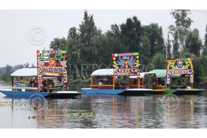 CIUDAD DE MÉXICO, 26MAYO2019.- Tres trajineras navegan sobre el canal de Xochimilco, bajo el intenso calor el cual alcanzó los 33grados centígrados durante la tarde de este domingo. FOTO: ROGELIO MORALES /CUARTOSCURO.COM