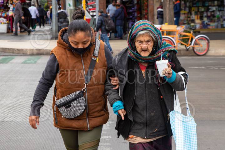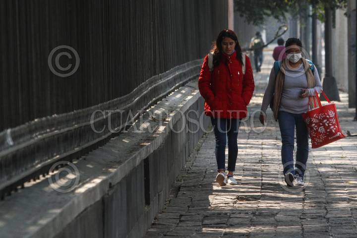 Dos mujeres transitan por la mañana en las calles del Centro Histórico a pesar de las bajas temperaturas.