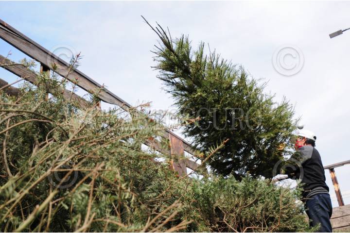 Un hombre acomoda los Pinos que fueron colocados en el Centro de Acopio ubicado en la Alcaldía Cuauhtémoc.