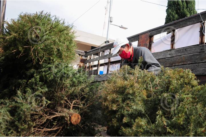 Un hombre carga su pino al camión que se encuentra recolectando estos árbolesque fueron adquiridos por decenas de familias para las fiestas decembrinas.