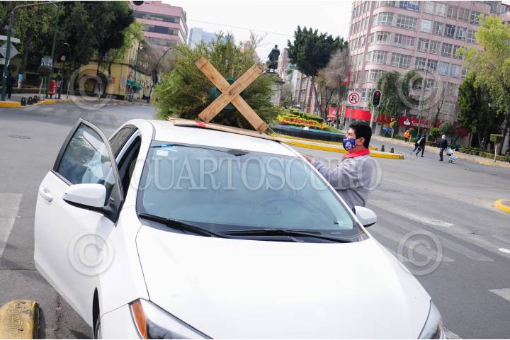 Un hombre llega a dejar su pino al centro de acopio instalado en la Alcaldía Cuauhtémoc.
